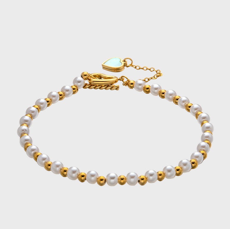 The Pearl Glow Gold Bracelet blends classic charm with modern softness. Featuring alternating polished gold beads and luminous pearls, it’s finished with a delicate heart accent for a subtle touch of sweetness. Light, refined, and perfect for everyday elegance.