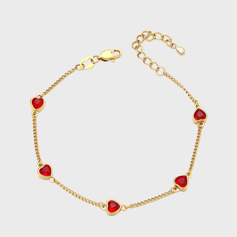 The Viva Heart Gold Bracelet adds a bright, playful touch to your everyday style. With its delicate gold chain and vibrant red heart stones, it brings a pop of color and a hint of romance to the wrist. Lightweight, charming, and perfect for wearing solo or stacking.