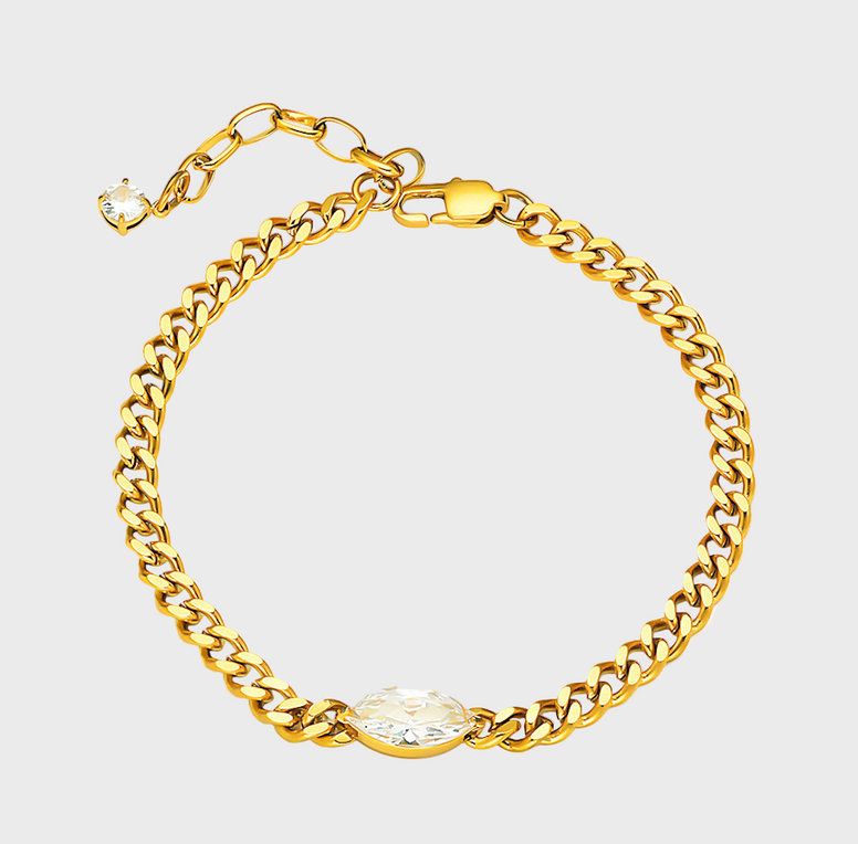 The Vyra Gold Chain Bracelet blends minimal design with a touch of radiant sparkle. Its polished gold chain is accented with a luminous oval cut crystal, creating a refined piece that feels modern, elegant, and effortlessly wearable. Perfect for stacking or adding a subtle glow on its own.